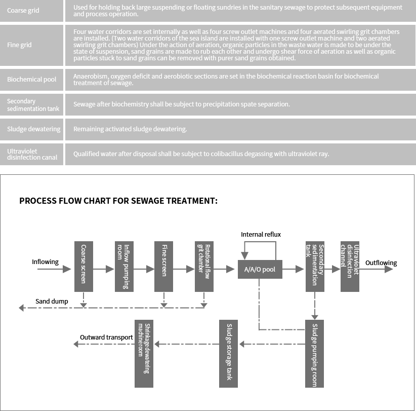 In activated sludge system of A/A/O processing technology, there are heterotrophic bacteria group, denitrifying bacteria group and denitrifying bacteria group which can decompose organic matter. The microbe groups are alternately in aerobic and anoxic environment and play their respective diferent efect. The organic matter will be completely decomposed by the aerobic bacteria, the dissolved organic matter and undissolved organic matter in the wastewater can turn part of the organic matter into simple inorganic through oxidation, at the same time, they can turn another part of organic matte into nutrients which can help the formation of a new protoplasm and make bacteria get growth. In this way, organic matter get degradation, and the water quality get improved. In biochemical treatment process, some obligate bacteria can decompose organic compounds which contain nitrogen in waste water into ammonia nitrogen, and denitrifying bacteria change the ammonia nitrogen into nitrates, the denitrifying bacteria change nitrates into nitrogen, so the nitrogenous organic compounds are eventually converted into harmless nitrogen and are wiped of from the water. TECHNOLOGICAL PROCESS