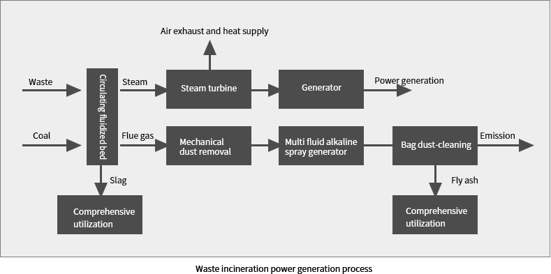 The combustion temperature of Circulating Fluidized Bed boiler will be controlled between 850 ? - 900?,so it has a low nitrogen oxides emission. Another important problem of garbage incineration method is that it will produce chlorine hydride and dioxin, according to foreign research, wastes incineration will produce dioxins under the condition of:combustion temperature is below 800 ?, combustion temperature is uneven, garbage burns incompletely. These can cause the precursor of dioxin (cp, cbs). The combustion temperature of Circulating Fluidized Bed Wastes Incinerator is stable and even. And the furnace shape design makes the smoke in the furnace stay longer, therefore, destroys the produce environment of the poisonous and harmful gas, so it radically reduce the emission of poisonous gases. TECHNOLOGICAL PROCESS